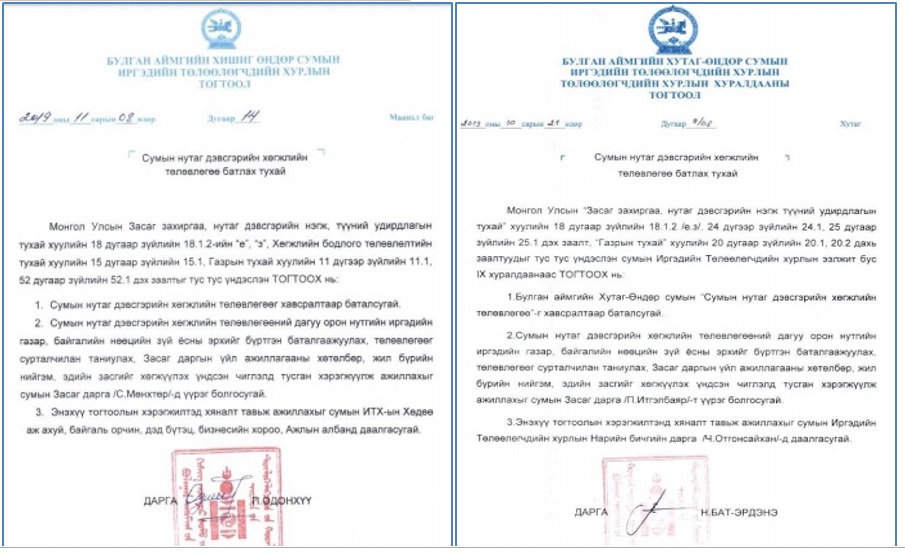 Аймгийн ИТХ-ын Тэргүүлэгчдийн 2018 оны 36 дугаар тогтоолоор аймгийн газар зохион байгуулалтын төлөвлөгөө, сумын нутаг дэвсгэрийн хөгжлийн төлөвлөгөө хийгдэж аймгийн ИТХ-ын тогтоолоор батлагдах хүртэлх хугацаанд сумын төвийн тэг гортиг дотор иргэн, хуулийн этгээдэд газар эзэмшүүлэх, өмчлүүлэх, ашиглуулах, өвөлжөө, хаваржааны доорх болон газар тариалангийн зориулалтаар эзэмшүүлэхээс бусад газрыг төлөвлөгөөнд тусгаж батлахыг түр хугацаагаар хориглосон шийдвэр гаргуулсан. Уг ажлын шийдвэрийн хүрээнд 2019 оны газар зорион байгуулалтын төлөвлөгөөнд Бүрэгхангай сум зуслангийн зориулалтаар 1,2 га, Баян-Агт сум амралтын зориулалтаар 0,1 га, Рашаант сум аялал жуулчлалын зориулалтаар 2 га, хөдөлмөр зуслангийн зориулалтаар 1 га газрыг тусгасан нь 36 дугаар тогтоолыг, Дашинчилэн сум мянганы зам дагуу худалдаа, үйлчилгээний зориулалтаар 0,21 га газрыг төлөвлөсөн нь сумын хөгжлийн ерөнхий төлөвлөгөөг, Сэлэнгэ сум Баянцагаанд зуслангийн зориулалтаар 2,8 га газрыг төлөвлөсөн нь сумын нутаг дэвсгэрийн хөгжлийн төлөвлөгөөг тус тус зөрчсөн тул дээрх тусгагдсан газруудад газар олголт хийхгүй гарсан шийдвэрийг цуцлах арга хэмжээг авах талаар 2019 оны 01/32 дугаар албан тоотыг хүргүүлсэн. Дээрх газруудад газар олголт хийгдээгүй бөгөөд 2019 оны 12 дугаар сард сумын ИТХ-р оруулан 2019 оны газар зохион байгуулалтын төлөвлөгөөнөөс хасалт хийлгэх шийдвэрийг сумын ИТХ-с гаргалаа.