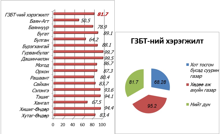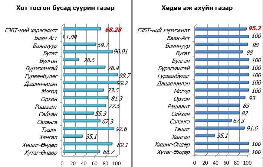2019 оны хот тосгон бусад суурин газарт нийт 1781 арга хэмжээ буюу 802,67 га газрыг төлөвлөснөөс 842 байршилд 628,49 га газрыг эзэмшүүлж, өмчлүүлж 68,2%, ХАА-н газарт нийт 260837,6 га газрыг төлөвлөж 348378,9 га газрын хэрэгжилтийг ханган 95,2% буюу 2019 оны тухайн жилийн газар зохион байгуулалтын төлөвлөгөөний биелэлтийг 81,7%-р биелүүлэн ажиллаа. /Сумдаар авч үзвэл/